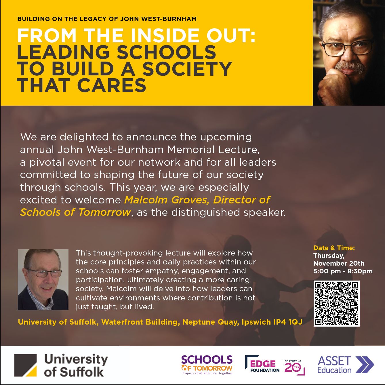 The second John West-Burnham Lecture. This year, we are thrilled to welcome our own Malcolm Groves, Director of Schools of Tomorrow and long-time collaborator of John West-Burnham, as our distinguished speaker. Malcolm will explore how the core principles and daily practices within schools can foster empathy, engagement and participation, creating a society rooted in care and contribution. Event Details: 📅 Thursday 20th November 2025 📍 University of Suffolk, Ipswich Extended Opportunities – Visit Inspiring Schools In addition to the evening lecture, there will be unique opportunities to see inspiring practice in action: Afternoon school visits/ workshops: Thursday 20th November from 12 pm Morning school visits: Friday 21st November These visits will showcase schools putting community engagement, student agency and care at the heart of their ethos - principles at the core of Schools of Tomorrow. Booking details to follow
