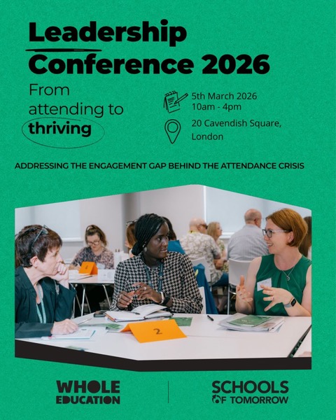 Attendance is a symptom. Engagement is the cause. With school attendance still not back to pre-pandemic levels, many leaders are asking deeper questions about belonging, relevance, and what makes young people want to be in school. On 5 March 2026, Schools of Tomorrow and Whole Education bring together school, trust and system leaders in London for our Leadership Conference 2026: 'From attending to thriving - addressing the engagement gap behind the attendance crisis'. This year’s conference focuses on what the ImpactEd report describes as “the engagement gap” — and how we can collectively create schools where every child, regardless of background, can thrive. Expect a day of research-informed insight, practical workshops, and shared learning with leading voices in education, leadership and youth policy. With keynotes and workshops from speakers: Rylie Sweeney, Richard Gerver, Robin Dunbar, Hywel Roberts and Jenny Anderson
